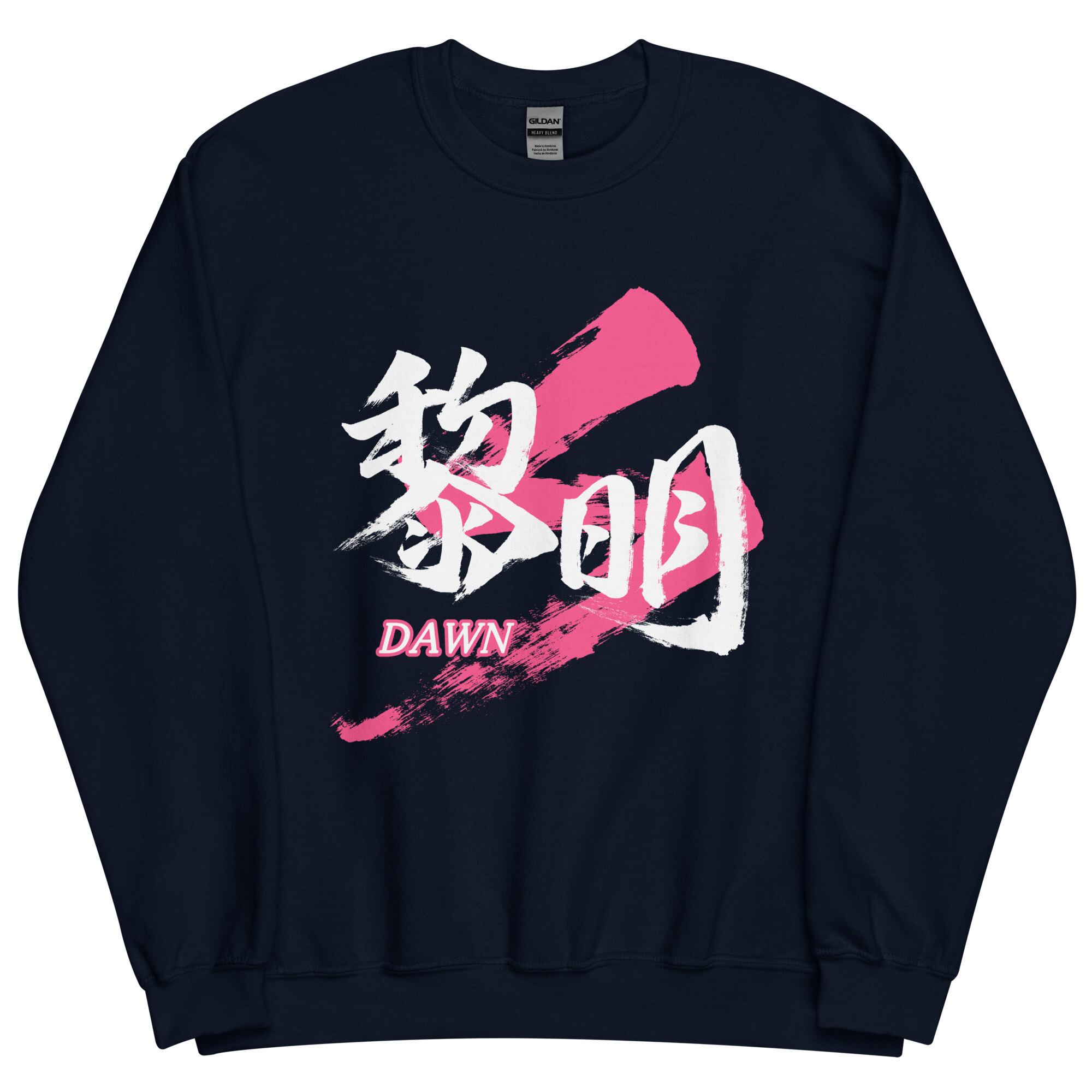 Designed with Japanese calligraphy. "黎明/DAWN" is printed on a navy sweatshirt. This Japanese Kanji for dawn is pronounced "Reimei" in Japanese.