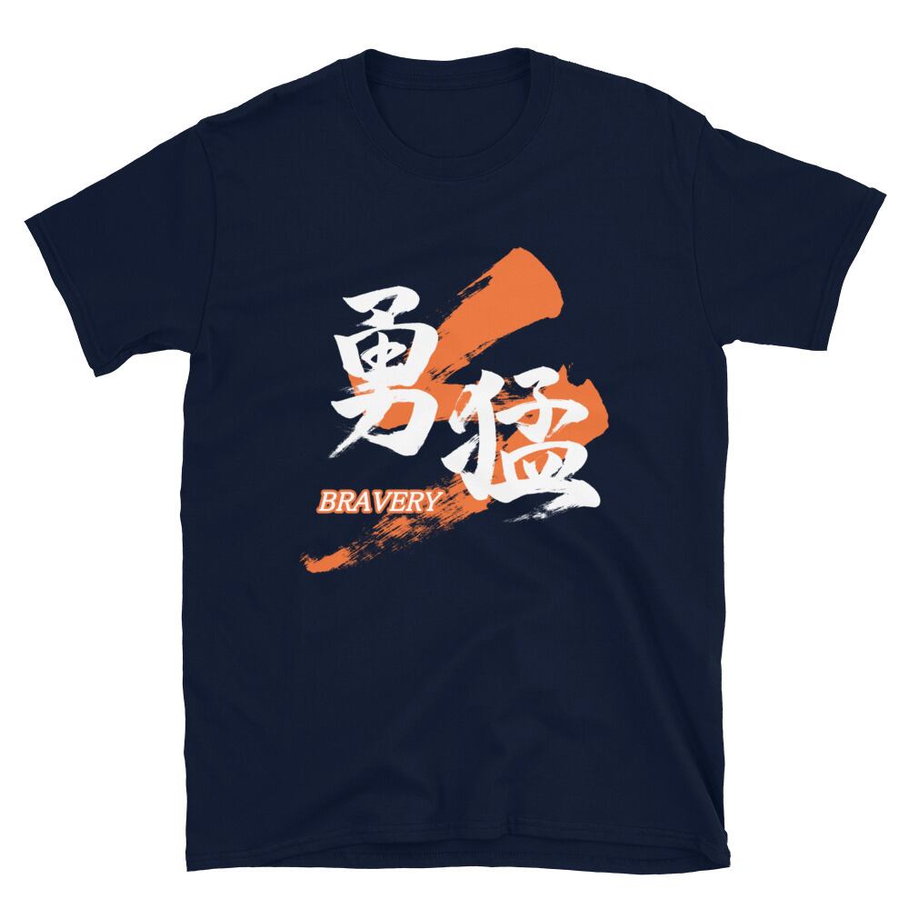 Designed with Japanese calligraphy. "勇猛/BRAVERY" is printed on a T-Shirt. This Japanese Kanji for bravery is pronounced "Yumo" in Japanese.