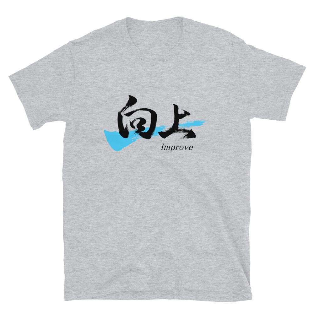 Designed with Japanese calligraphy. "向上/Improve" is printed on a T-Shirt. This Japanese Kanji for improve is pronounced "Kojo" in Japanese.