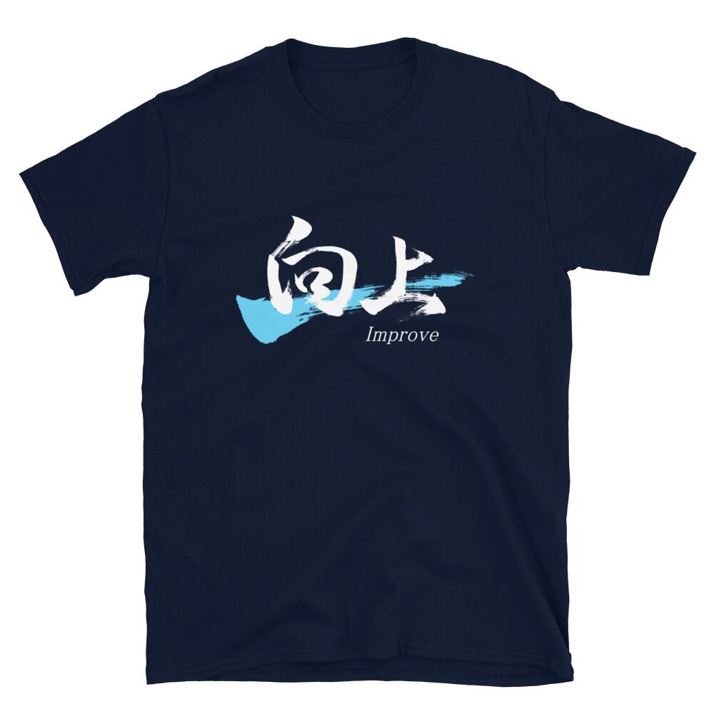 Designed with Japanese calligraphy. "向上/Improve" is printed on a T-Shirt. This Japanese Kanji for improve is pronounced "Kojo" in Japanese.