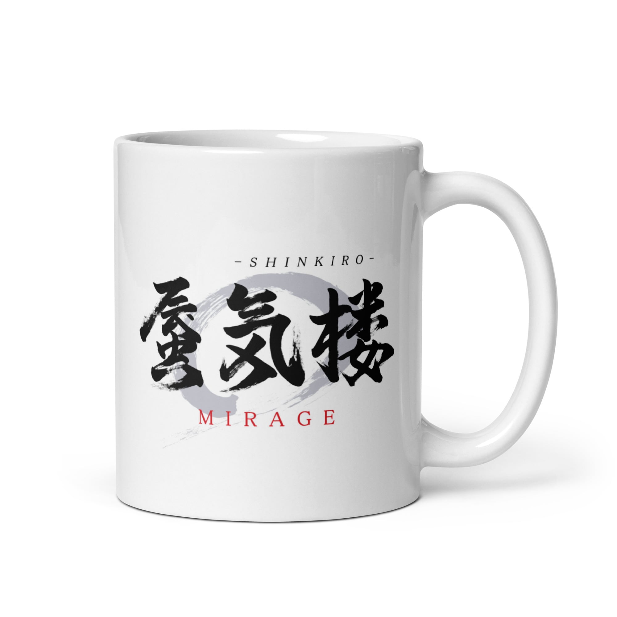 Designed with Japanese calligraphy. "蜃気楼/Mirage" is printed on a mug. This Japanese Kanji for mirage is pronounced "Shinkiro" in Japanese.