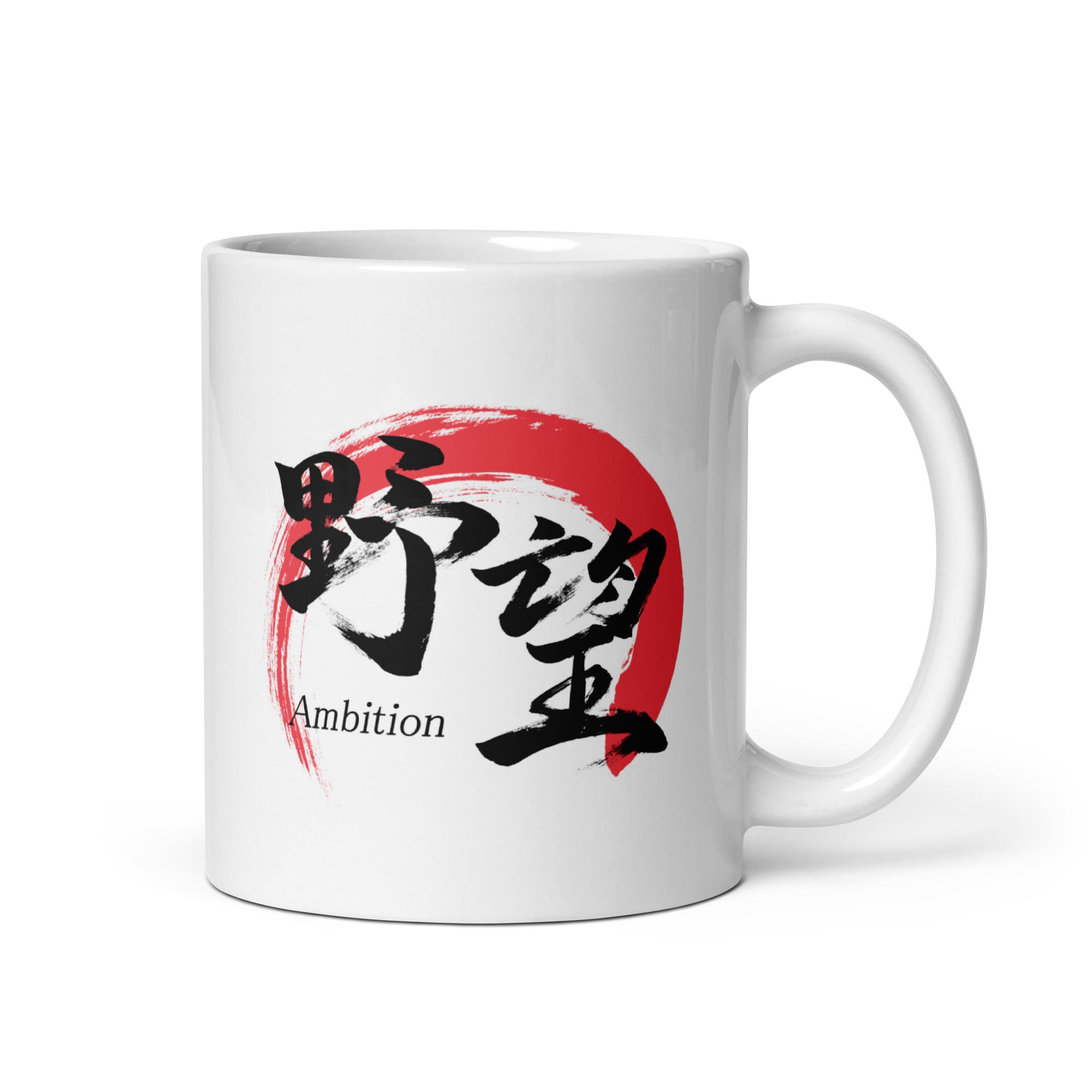 Designed with Japanese calligraphy. "野望/Ambition" is printed on a mug. This Japanese Kanji for ambition is pronounced "Yabo" in Japanese.