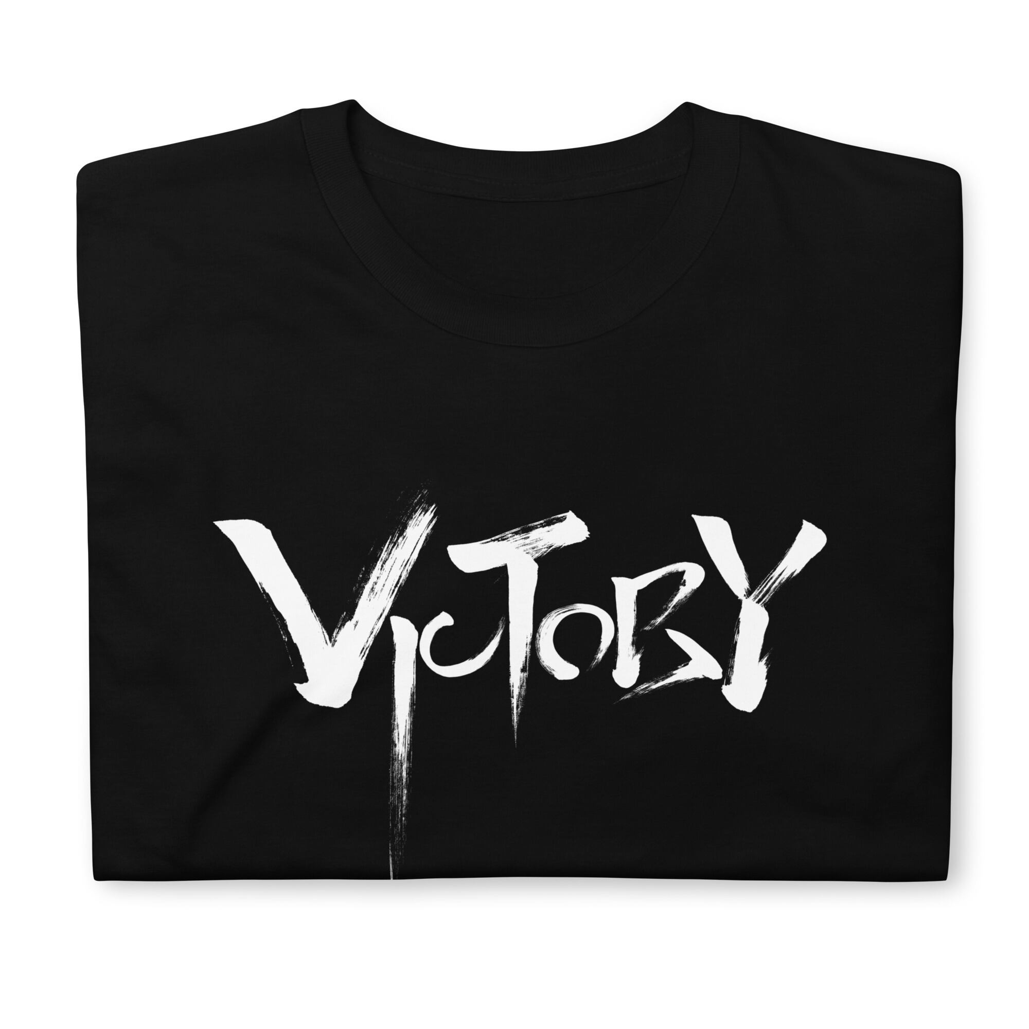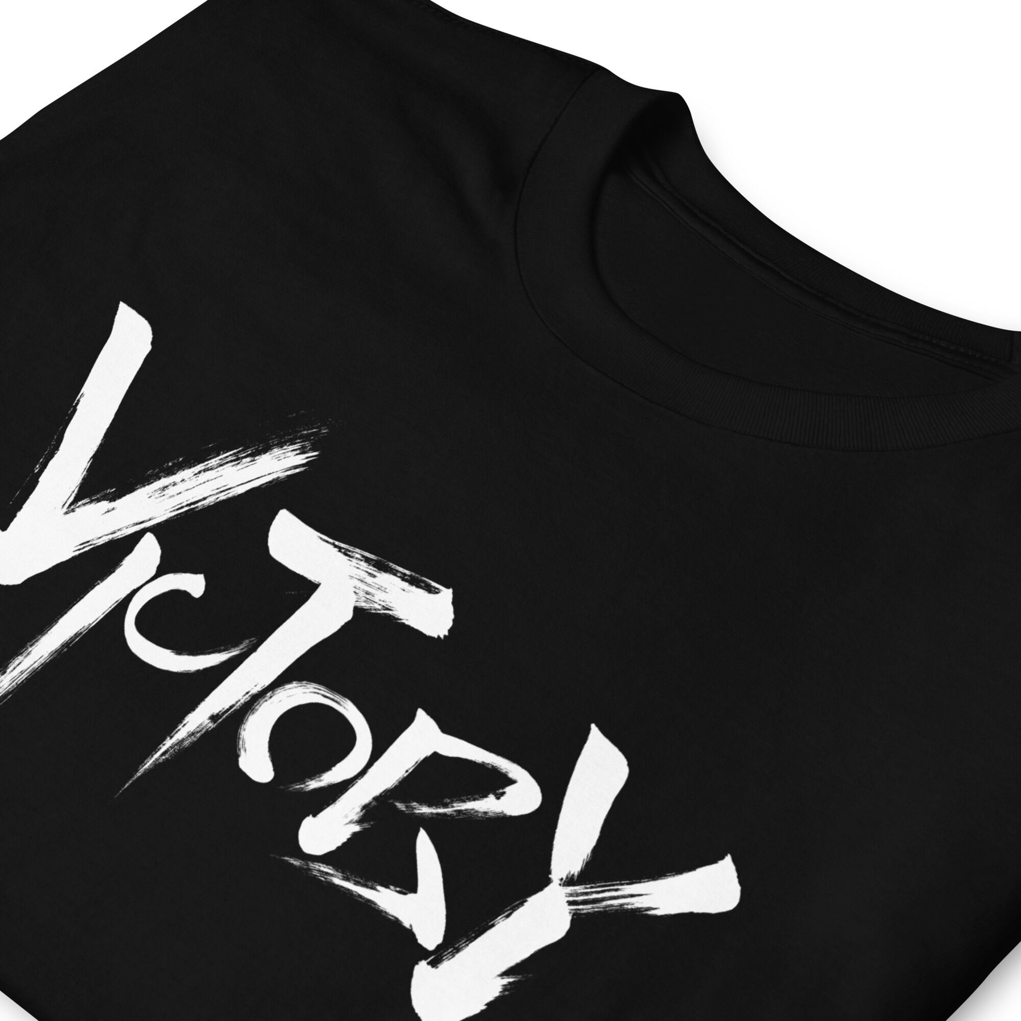 "VICTORY" is printed on a black T-Shirt. Designed with Japanese calligraphy.
